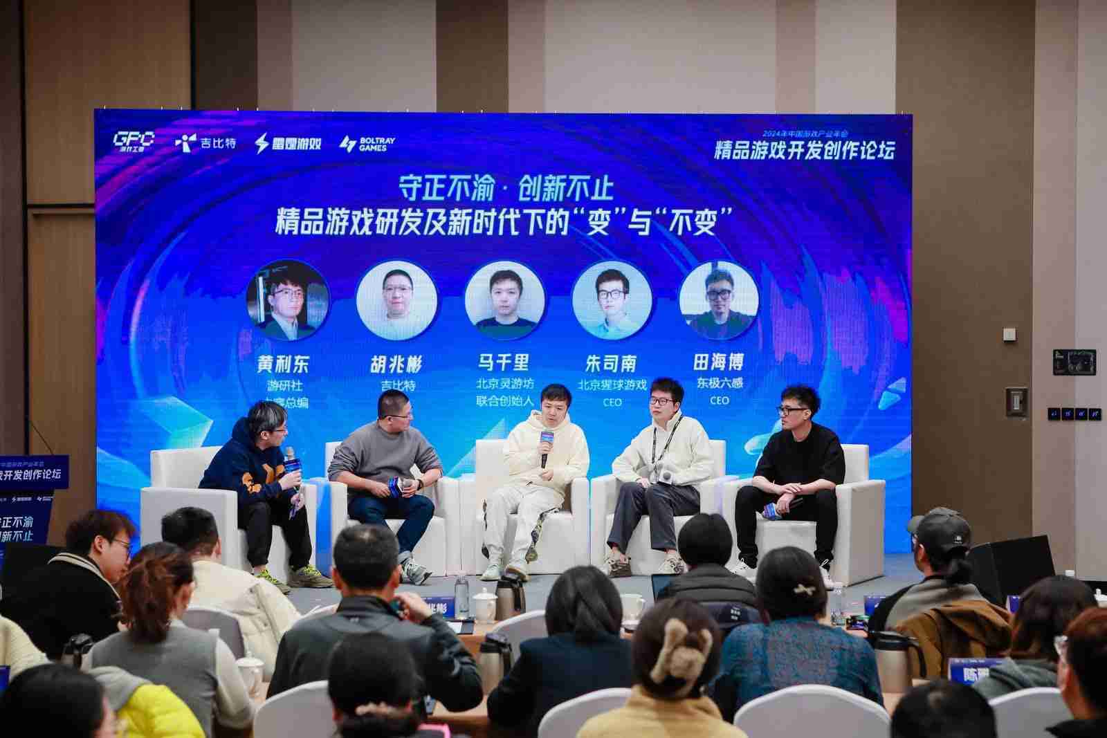 圆桌对话环节,,在游研社内容总编黄利东的主持下,,JIUYOU.COMCTO胡兆彬、、、北京灵游坊联合创始人马千里、、、、北京猩球游戏CEO朱司南、、、东极六感CEO田海博等四位嘉宾围绕“守正不渝、、创新不止——精品游戏研发及新时代下的‘变’与‘不变’”这一主题分享了各自在精品游戏开发理念及工程能力搭建方面的见解和经历,,,并就行业变化下游戏人需要坚守的理念等展开交流探讨。。。。