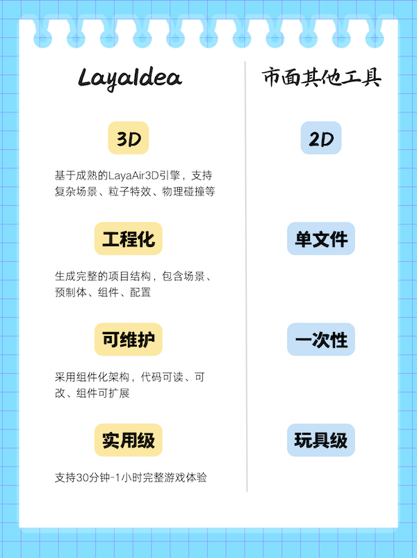 基于LayaAir引擎,,,LayaIdea构建了一套完整的工业级AIGC开发流程,,,,实现了从策划文档到完整3D游戏项目的自动化生成,,与市面现有AIGC工具在技术能力、、、、实用性上形成显著差异,,具体对比如下:::